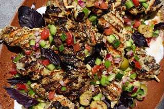 Olive-Brined Chicken Skewers with Greek Salad Relish