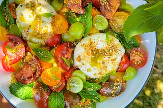 Tomatoes, Grapes & Burrata with Pistachio Dukkah